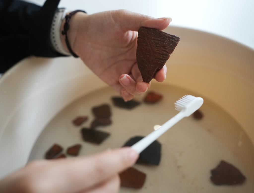 3月11日,在辽宁省朝阳市北票市的考古人员住所,考古人员在清洗调查现场发现的碎陶片。当日,来自辽宁省文物考古研究院的考古人员在辽宁省朝阳市双塔区调查红山文化遗址。此前,考古人员在辽宁省朝阳市凌源无白丁遗址群新发现多处红山文化遗迹。新华社记者 李钢 摄