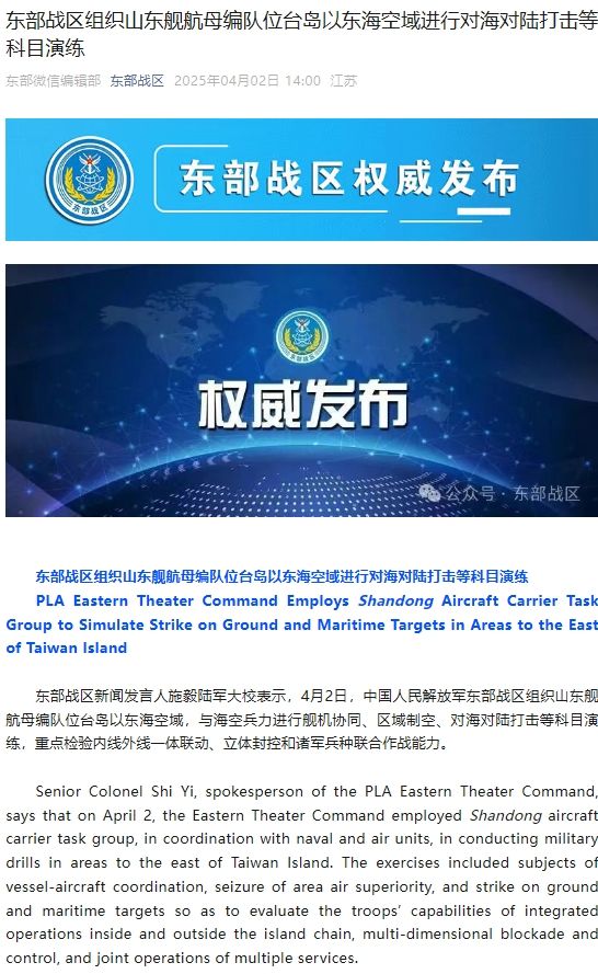 东部战区新闻发言人施毅陆军大校表示,4月2日,中国人民解放军东部战区组织山东舰航母编队位台岛以东海空域,与海空兵力进行舰机协同、区域制空、对海对陆打击等科目演练,重点检验内线外线一体联动、立体封控和诸军兵种联合作战能力。