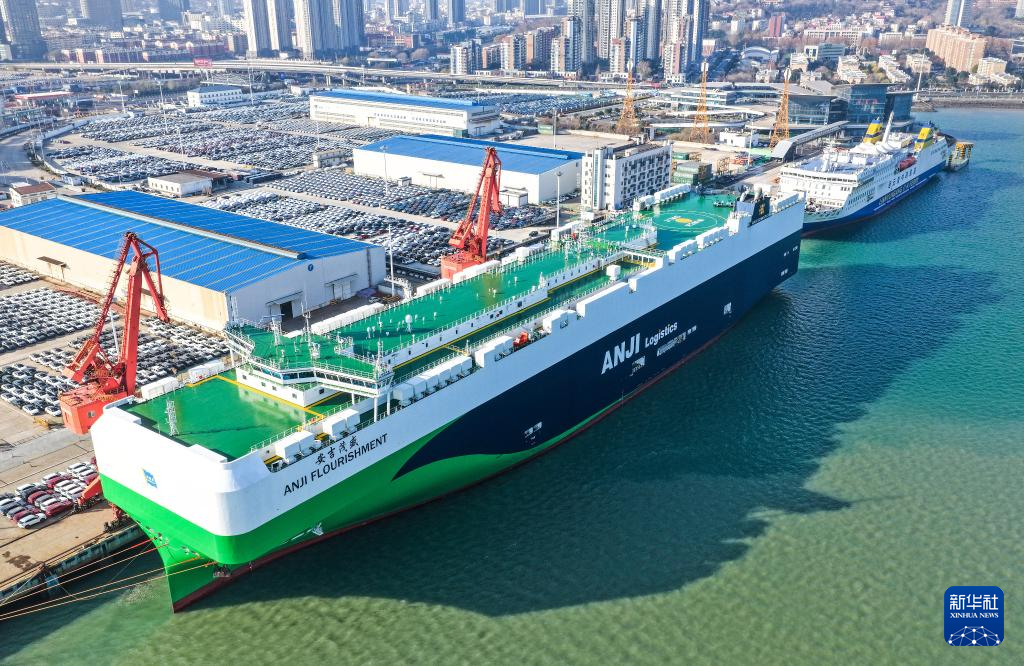 2025年12月17日,在江苏连云港港口68号泊位,一艘滚装船在装运出口汽车(无人机照片)。新华社发(王健民 摄)