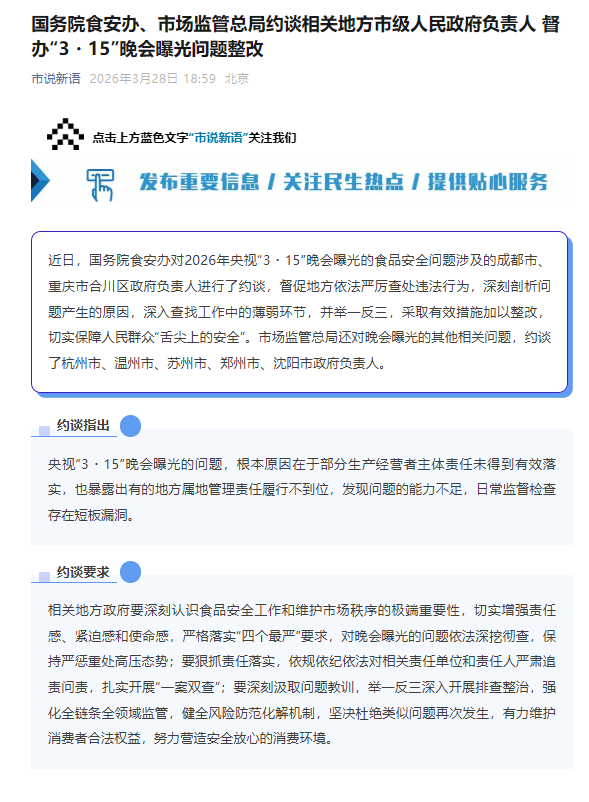 国务院食安办、市场监管总局约谈相关地方市级人民政府负责人 督办“3・15”晚会曝光问题整改