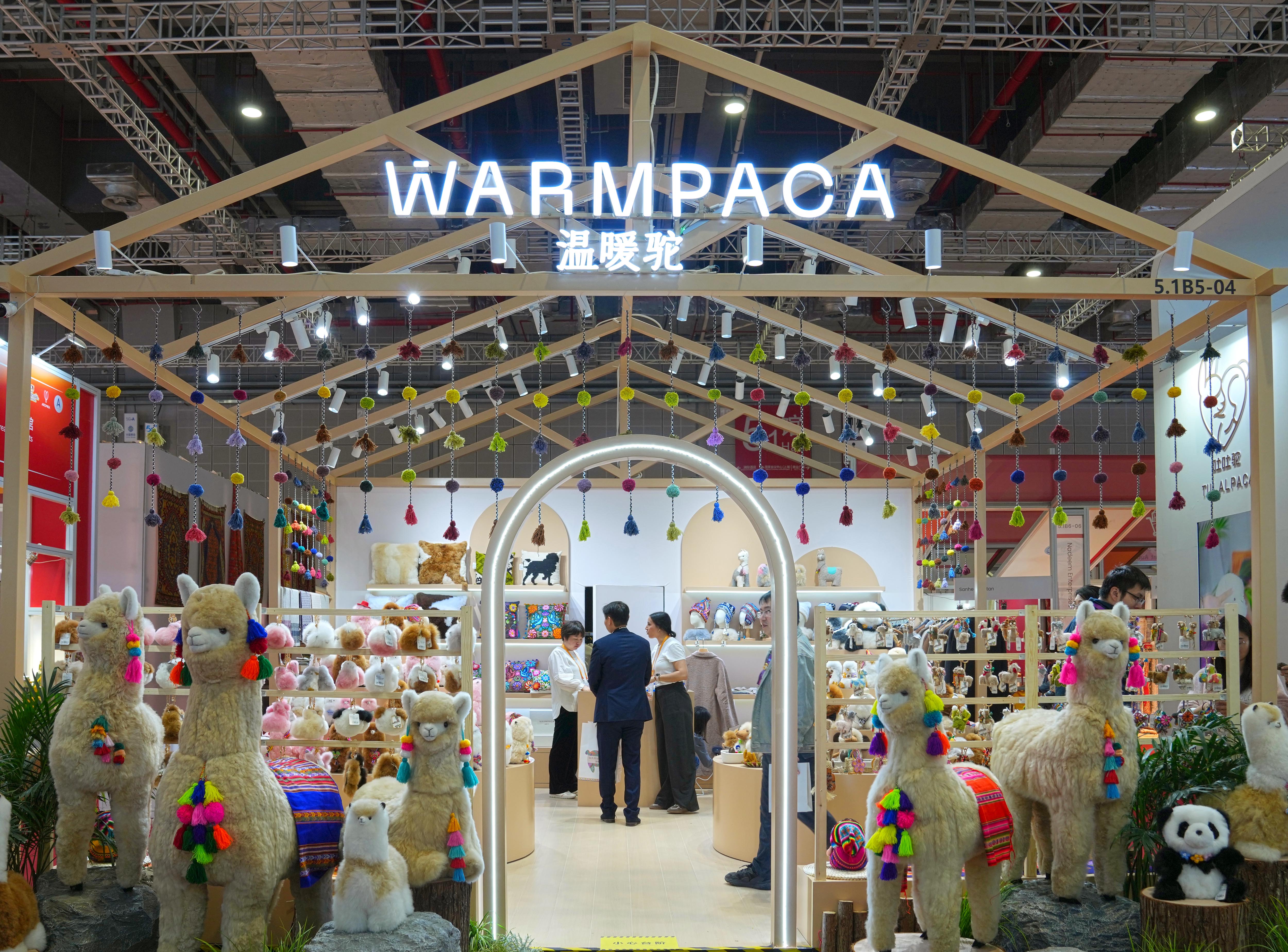 2025年11月5日在第八届进博会消费品展区拍摄的“温暖驼”展台。从秘鲁阿雷基帕的小店,到进博会的展台,再到全球消费者手中,进博会为“温暖驼”带来了巨大的发展机遇。本届进博会,“温暖驼”展位面积已从2018年首届进博会的9平方米拓展至54平方米,并在上海、厦门等地开设6家门店。源自进博会的“温暖驼”订单不仅助力秘鲁200多个家庭脱贫,还倒逼一场“品质革命”,让羊驼玩偶制作对标世界标准。