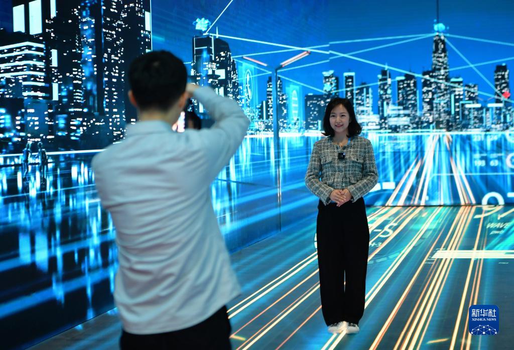 4月26日,在第六届数字中国建设成果展览会上,媒体记者在激光全息投影现场体验拍摄。新华社记者 魏培全 摄
