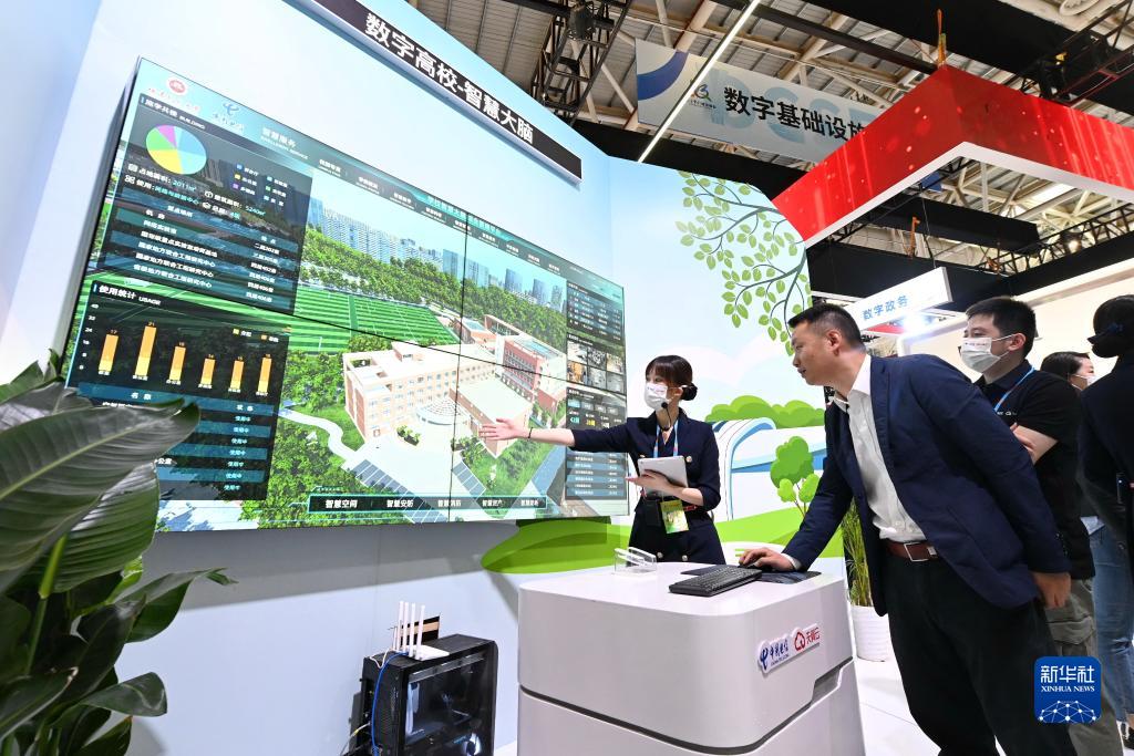 4月26日,数字福建建设成果专区工作人员在展览现场向参观者介绍数字高校智慧大脑综合管理平台,该平台由福建师范大学和中国电信福州分公司联手打造。新华社记者 林善传 摄