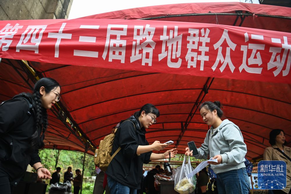 ↑一名参赛选手(左二)在赛场旁的农产品展销会上购买特色食品。新华社记者 邹竞一 摄
