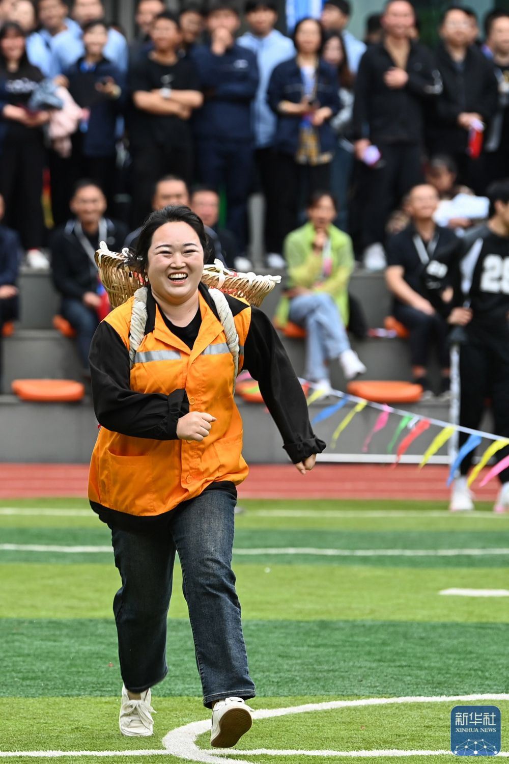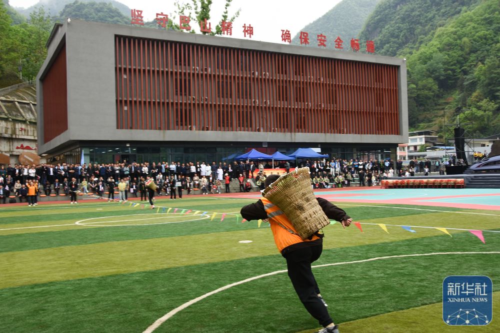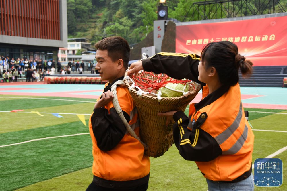 ↑参赛选手在运动会上参加背背篓比赛。新华社记者 邹竞一 摄