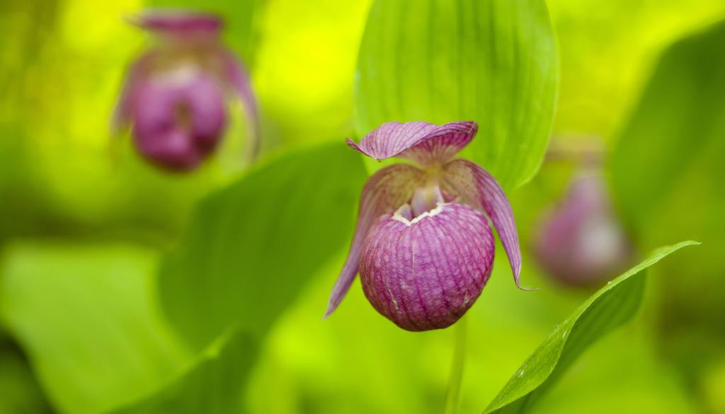 大花杓兰因其形状酷似一个口小肚大的囊袋,又名“大口袋兰”。花体呈紫红色,花朵直径5厘米至6厘米,是中国野生兰花中观赏价值较高的一种。目前,北方自然分布的大花杓兰野生种群濒临灭绝,被列为国家二级保护野生植物。