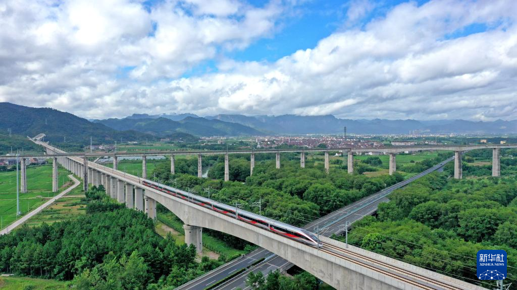 7月30日,一动车组列车行驶在杭温高铁台州市仙居县境内的线路上(无人机照片)。新华社发(王华斌摄)