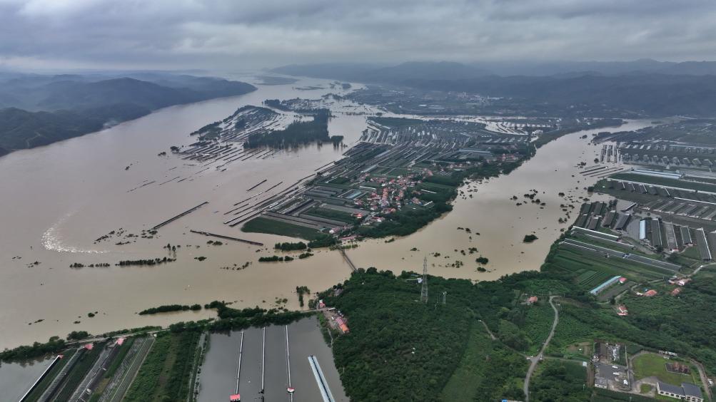 这是7月31日拍摄的太平湾街道部分水淹区域以及鸭绿江水面(无人机照片)。新华社记者龙雷 摄