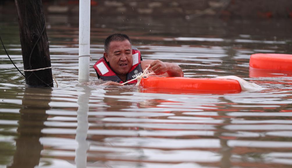 7月31日,一名工作人员在太平湾街道望江村内涝区域固定抽水管道。新华社记者龙雷 摄
