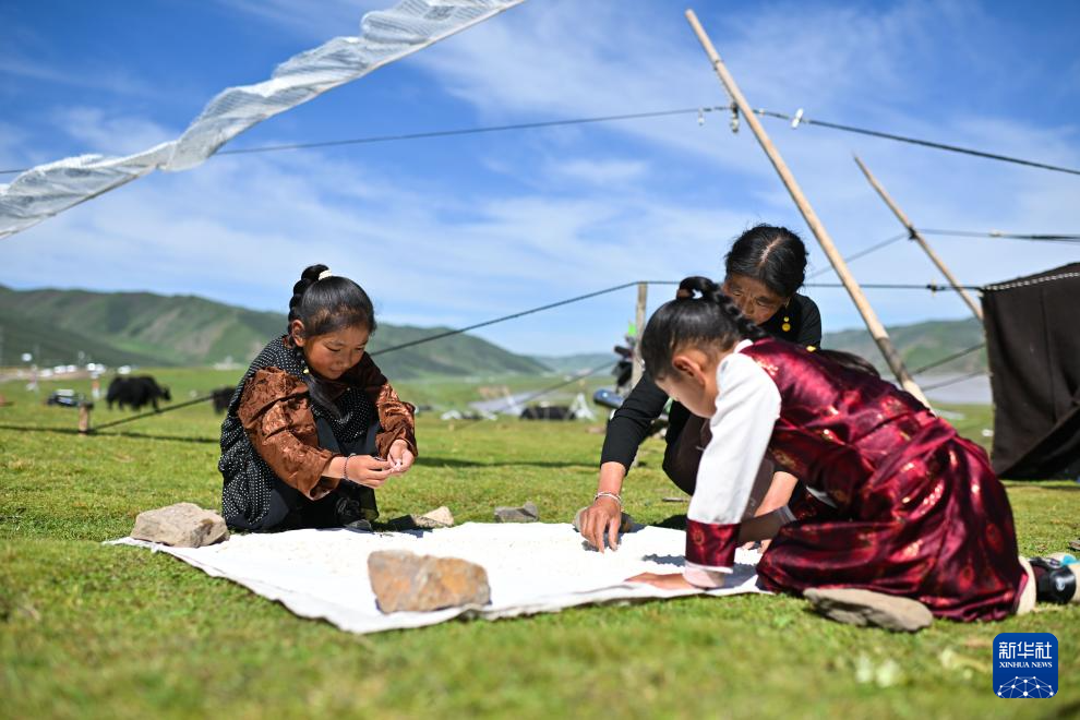 8月1日,尕玛拉毛(左)在帮妈妈晒曲拉(一种奶制品)。新华社记者 张龙 摄