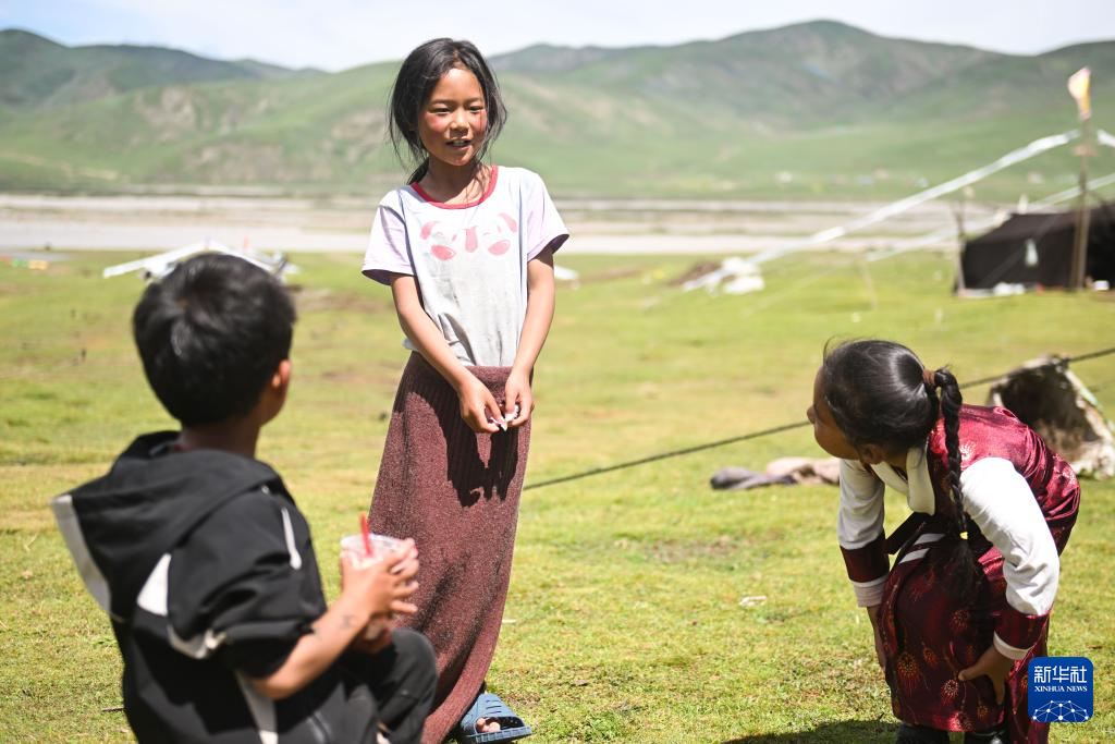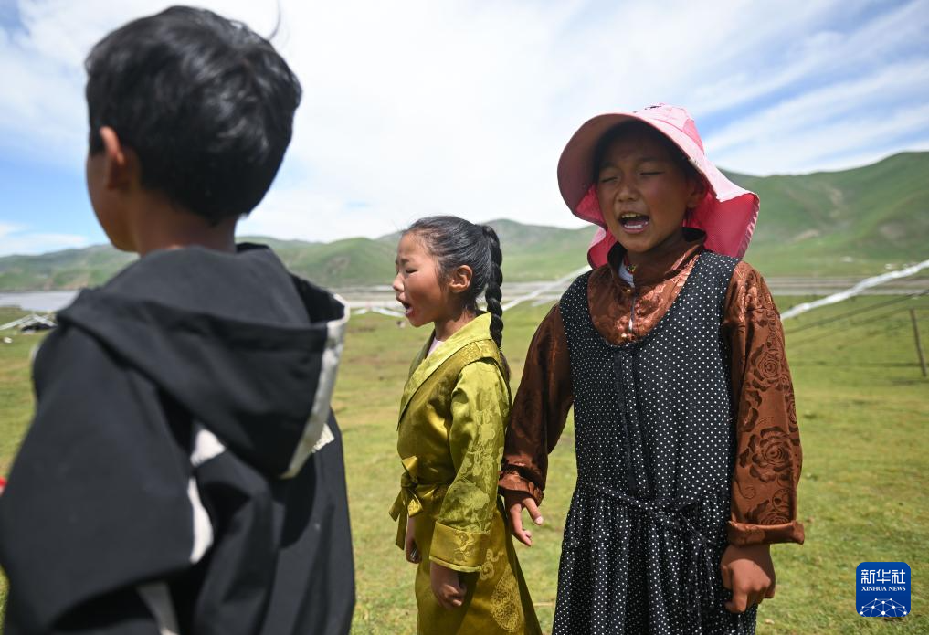 8月1日,多杰措(中)做游戏输了后在唱歌。新华社记者 张龙 摄