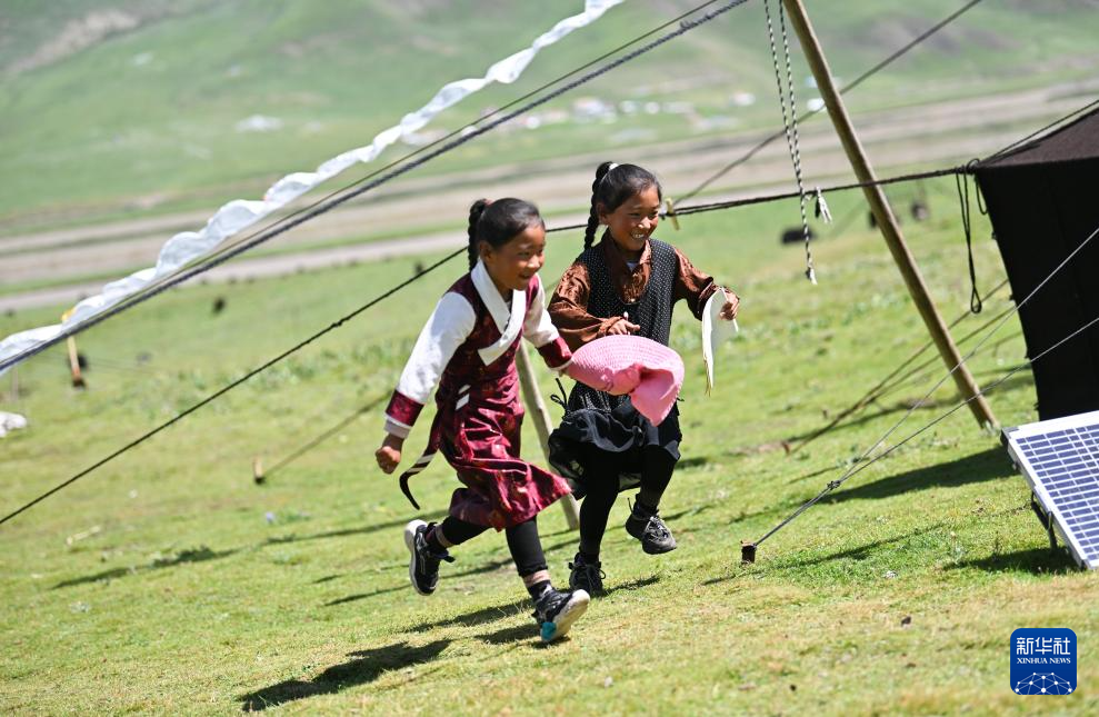 8月1日,尕玛拉毛(右)和妹妹卓玛央格在玩耍。新华社记者 张龙 摄