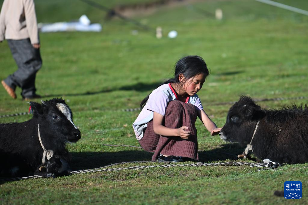 7月31日,多杰措在草原上抚摸一只牦牛牛犊。新华社记者 张龙 摄