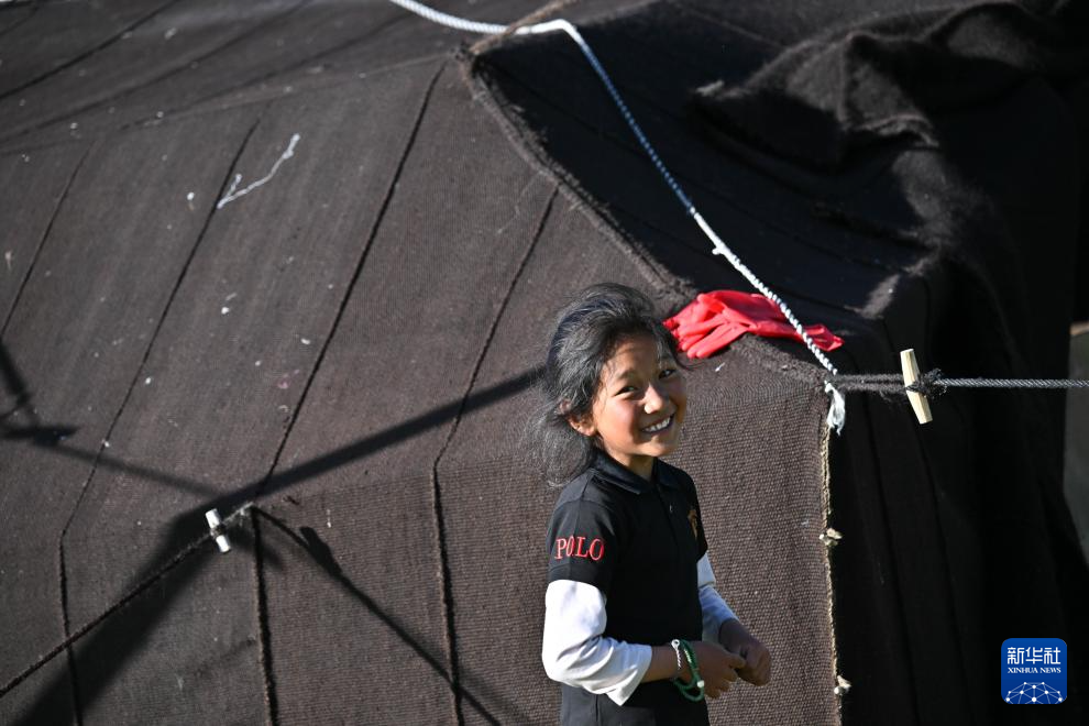 7月31日,尕玛拉毛在自己的牦牛帐篷前玩耍。新华社记者 张龙 摄