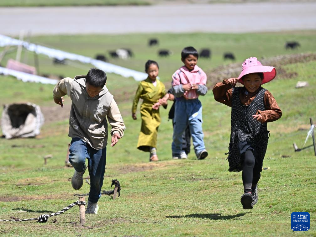 8月1日,尕玛拉毛(右一)与小伙伴在玩耍。新华社记者 张龙 摄