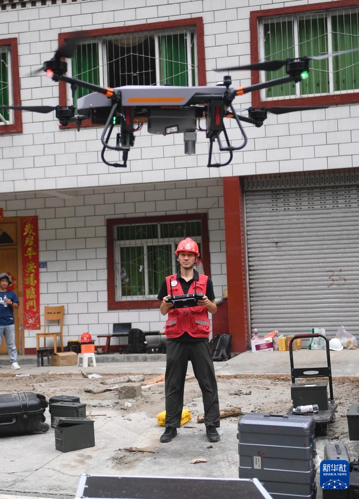 8月4日,四川省地质调查研究院工作人员操作搭载了激光雷达的无人机执行日地村受灾现场三维点云数据采集任务。新华社记者 刘坤 摄