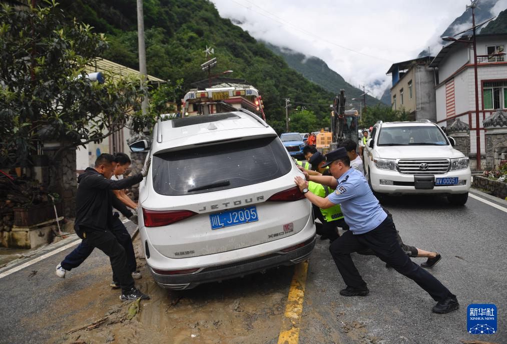 8月4日,在四川甘孜州康定市姑咱镇日地村,民警与村民转移被困车辆。新华社记者 刘坤 摄