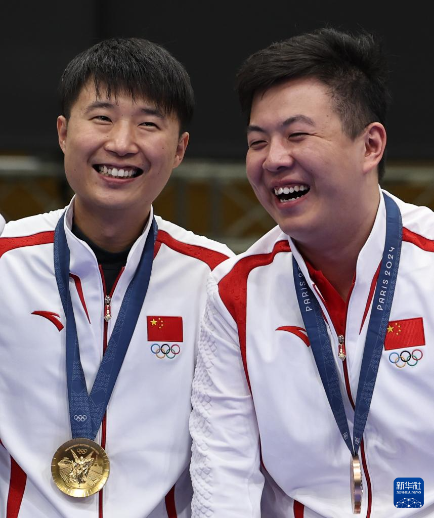 8月5日,冠军中国选手李越宏(左)和季军中国选手王鑫杰在颁奖仪式上。新华社记者 张帆 摄