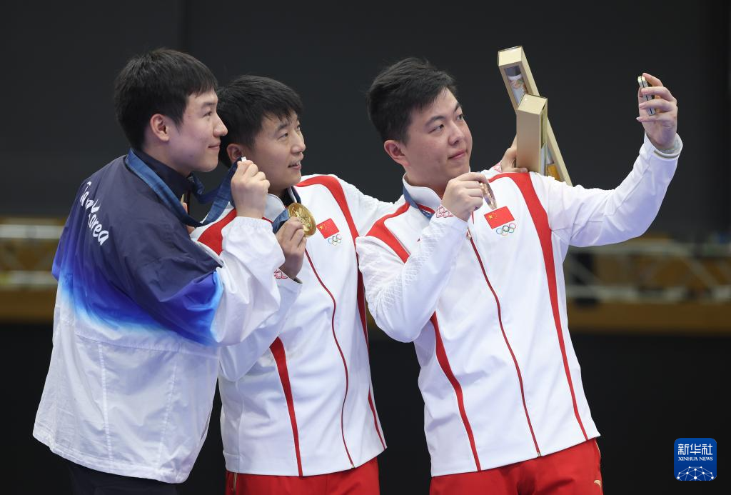 8月5日,冠军中国选手李越宏(中)、亚军韩国选手赵永宰(左)和季军中国选手王鑫杰在颁奖仪式上合影。新华社记者 赵丁喆 摄