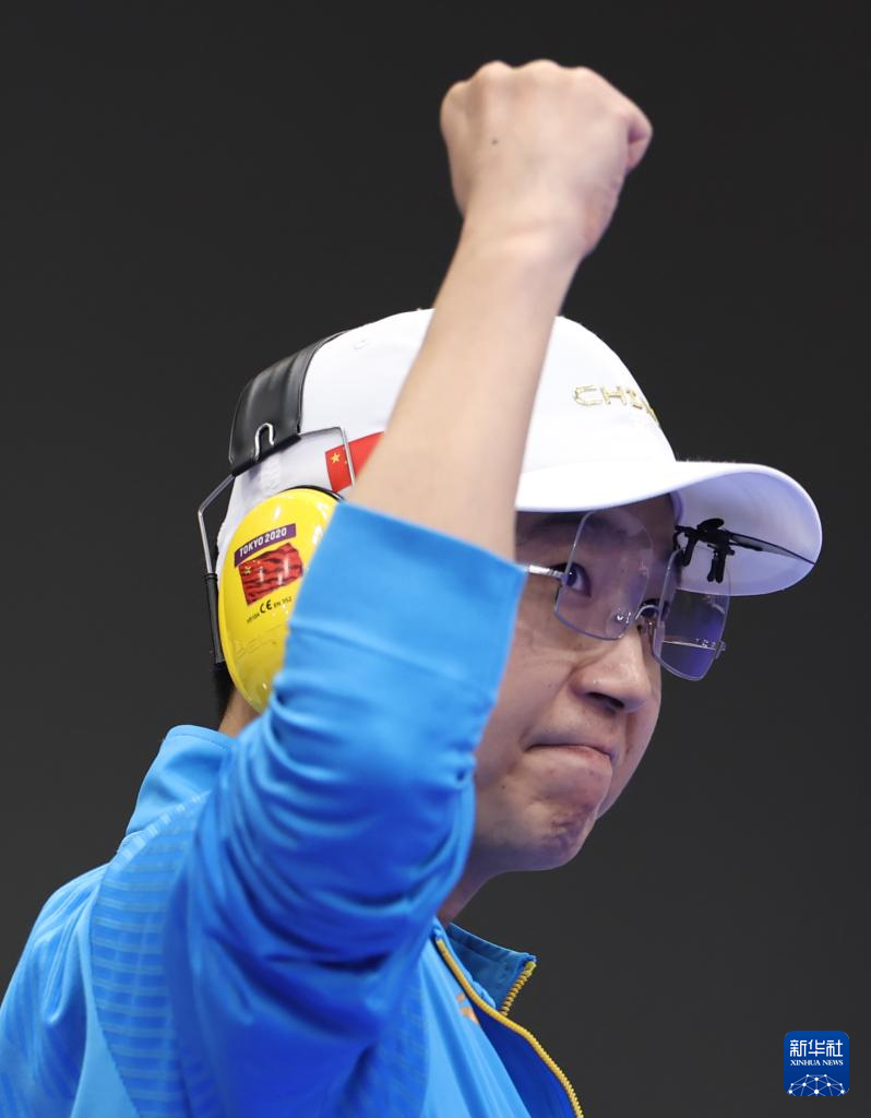 8月5日,中国选手李越宏在最后一枪后庆祝。新华社记者 张帆 摄