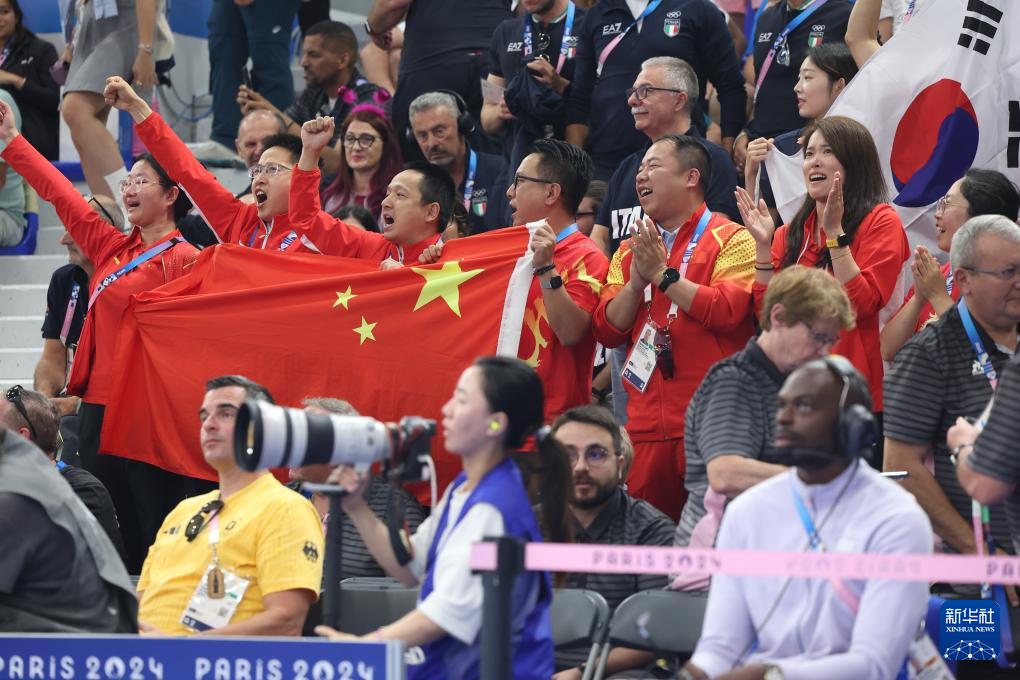 8月5日,中国射击队成员在现场观赛。新华社记者 赵丁喆 摄