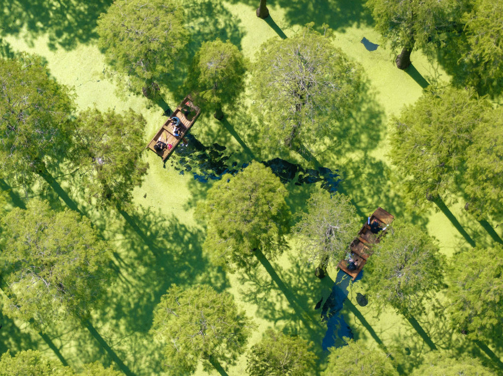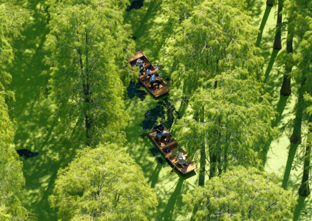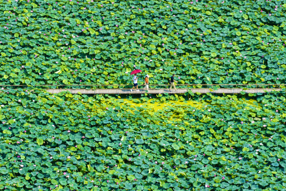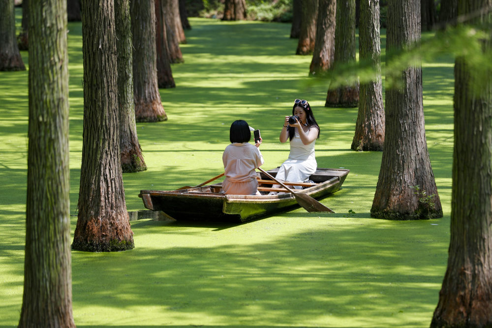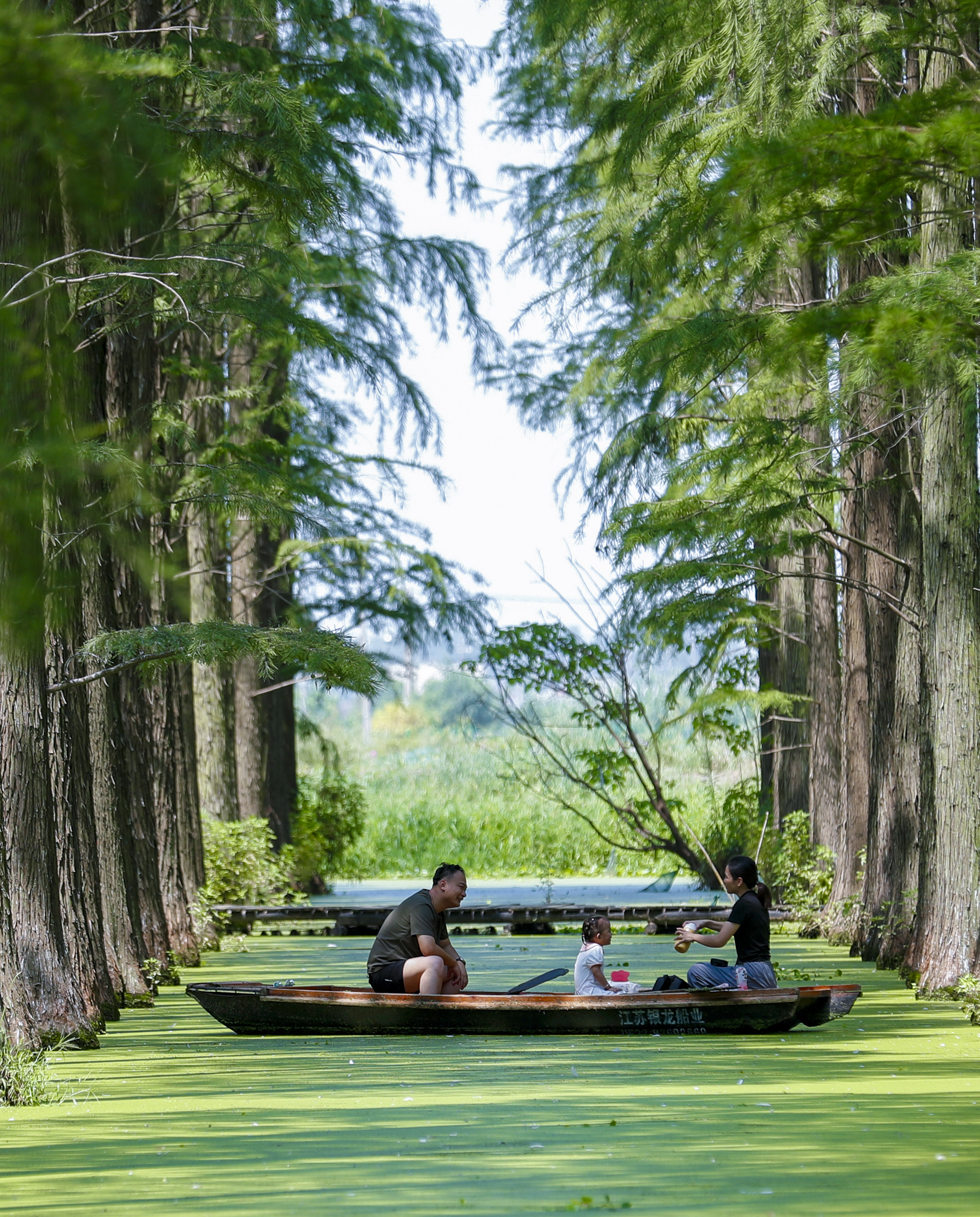 高温时节,江苏省扬州市江都区渌洋湖湿地公园“水上森林”绿树成荫,郁郁葱葱,吸引了不少游客前来赏景游玩,乐享清凉。