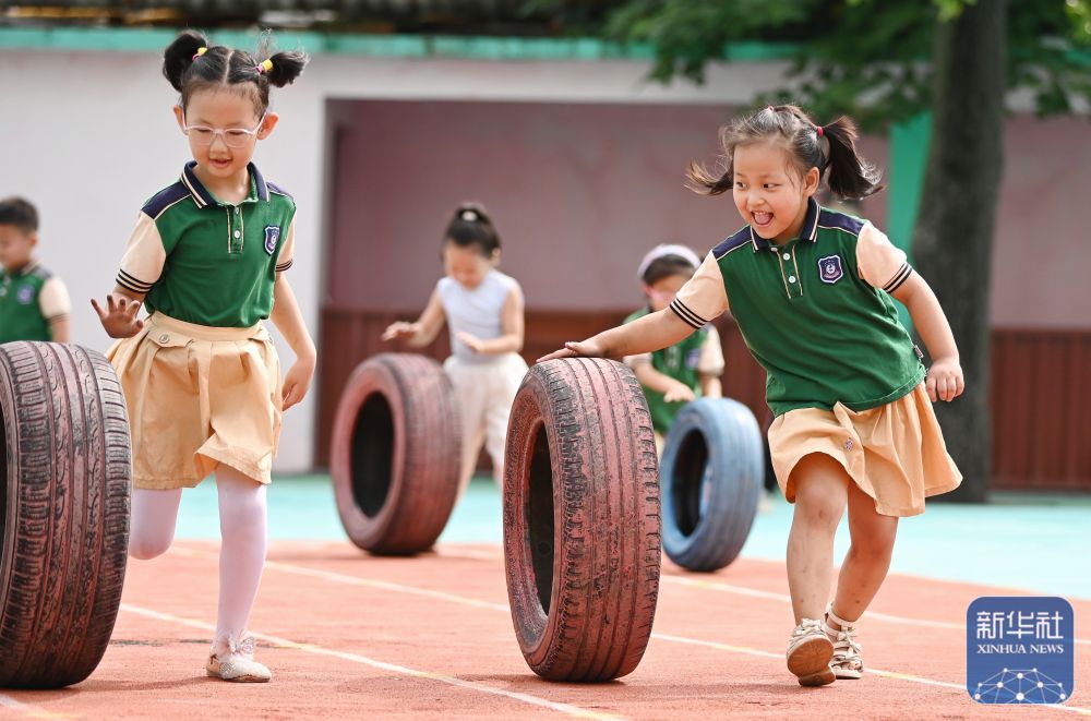 ↑9月2日,小朋友们在山东省滕州市西岗镇中心幼儿园玩游戏。新华社发(李志军摄)