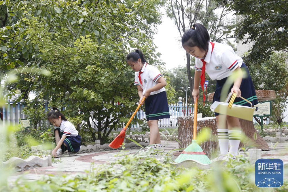 ↑9月2日,在河北省邢台市南和区第一小学“开学第一课”活动上,学生参加户外劳动。新华社发(张驰摄)