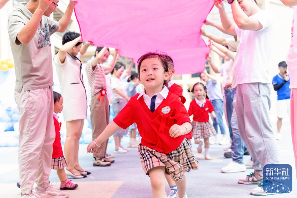 ↑9月2日,在浙江省温州市第三十幼儿园,小朋友们在参加亲子游戏。新华社发(刘吉利摄)