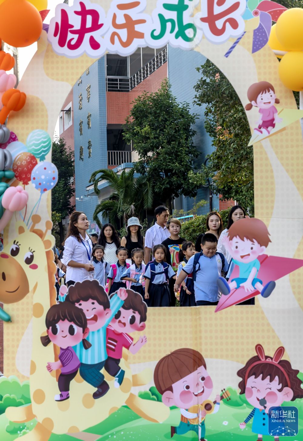 ↑9月2日,在贵州省黔西市第一小学,一年级新生在家长的陪同下进入校园。新华社发(范晖摄)