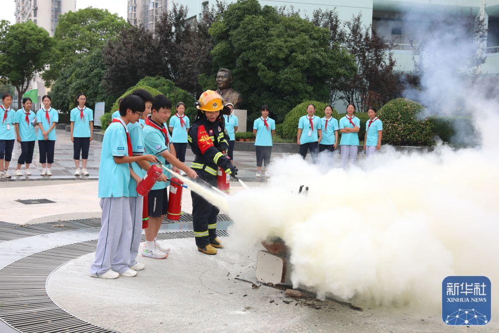 ↑9月2日,在江苏省淮安市洪泽外国语中学“开学第一课 消防安全进校园”活动上,学生在消防员的指导下体验使用灭火器。新华社发(殷潮摄)