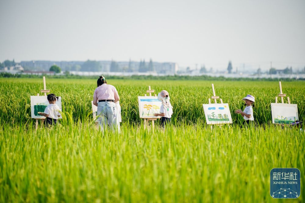↑9月2日,在四川省眉山市彭山区观音街道兴崇社区千亩粮油基地,学院路幼儿园的小朋友在“开学第一课”活动上进行田间写生。新华社发(翁光建摄)