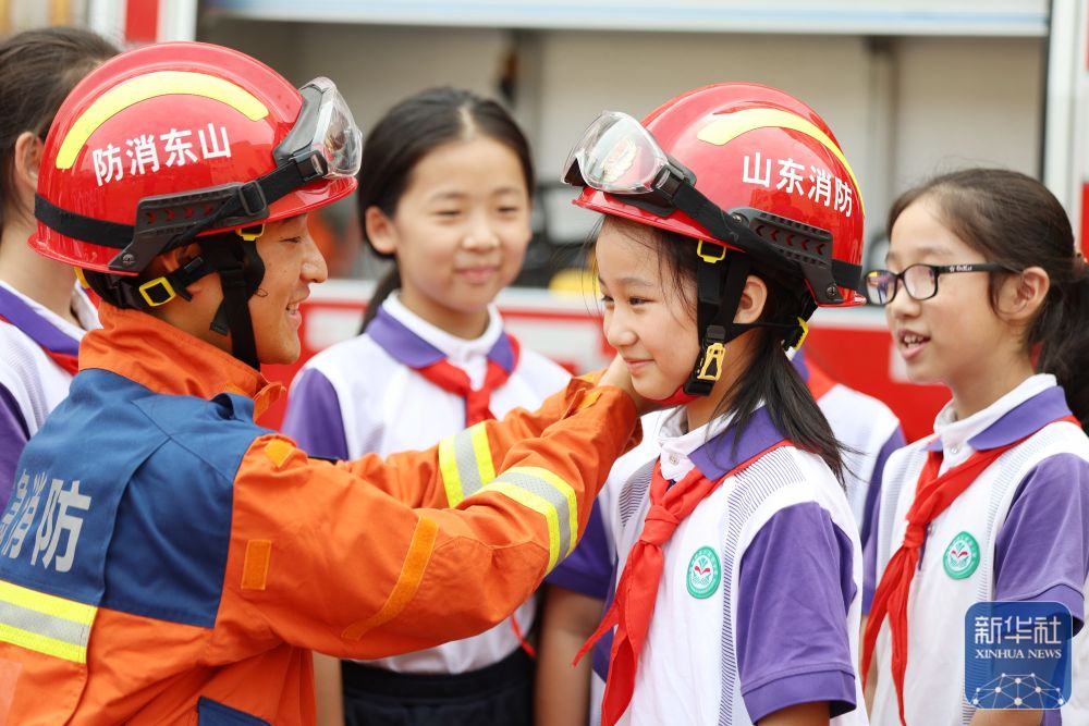 ↑9月2日,在山东省临沂市郯城县第六实验小学,小学生在消防救援人员的帮助下体验穿戴消防防护装备。新华社发(张春雷摄)