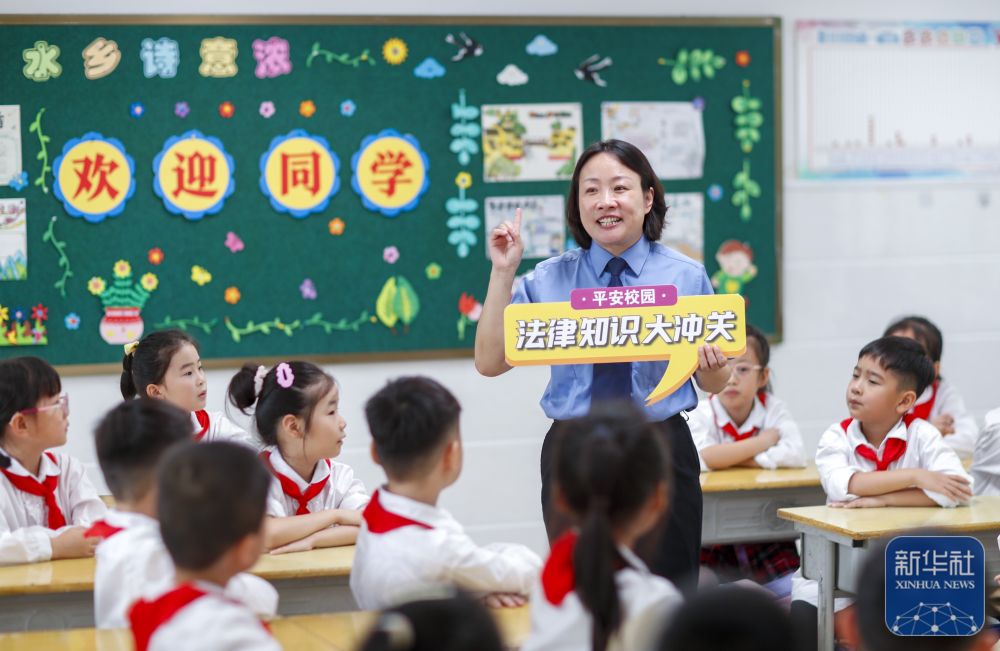 ↑9月2日,江苏省兴化市人民检察院未成年人法治宣讲团的工作人员走进兴化市文峰小学,给学生们讲解法律知识。新华社发(周社根摄)