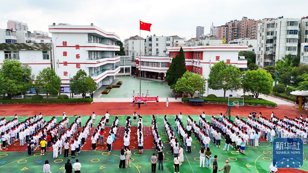 ↑9月2日,江苏省连云港市海州区大庆路小学学生在参加升国旗仪式(无人机照片)。新华社发(耿玉和摄)