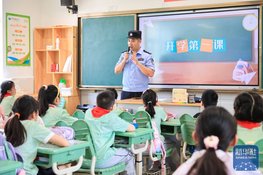 ↑9月2日,在南京市南湖第一小学“开学第一课”主题宣讲活动上,民警向小学生们宣讲校园安全知识。新华社发(苏阳摄)