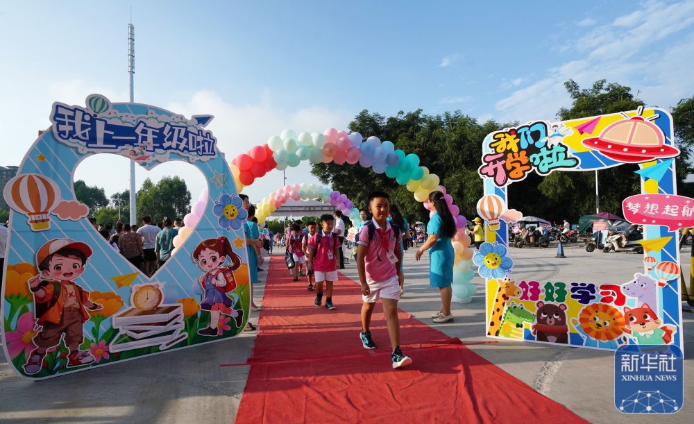 ↑9月2日,在广西融水苗族自治县融水镇水东小学,学生们走进校园。新华社发(龙林智摄)