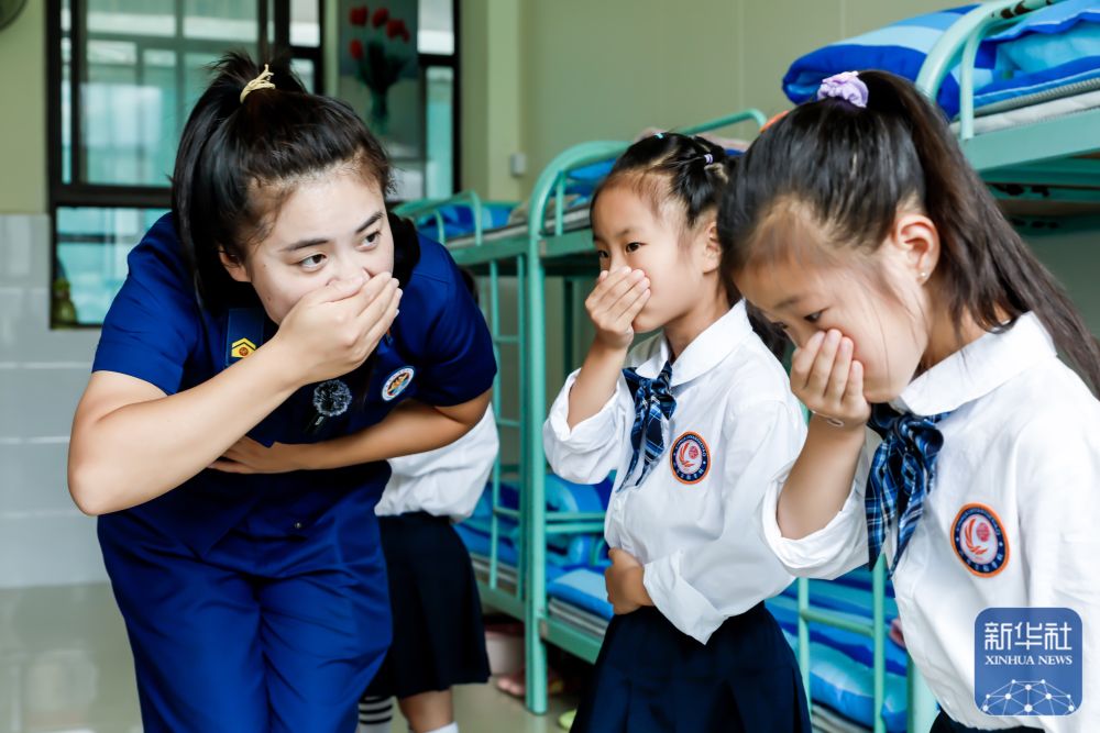 ↑9月2日,在河南省焦作市武陟县兴华实验学校宿舍,消防员为一年级新生讲解火灾逃生方法。新华社发(王琳锋摄)