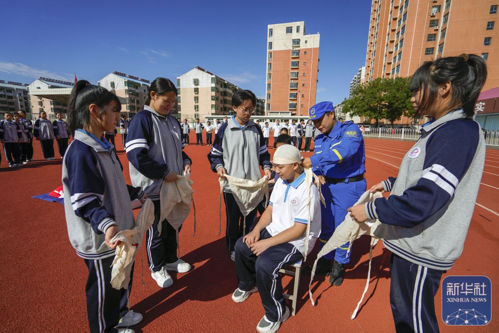 ↑9月2日,在河北省遵化市第二中学“开学第一课”活动上,蓝天救援队队员为学生们讲解急救包扎技能。新华社发(刘满仓摄)