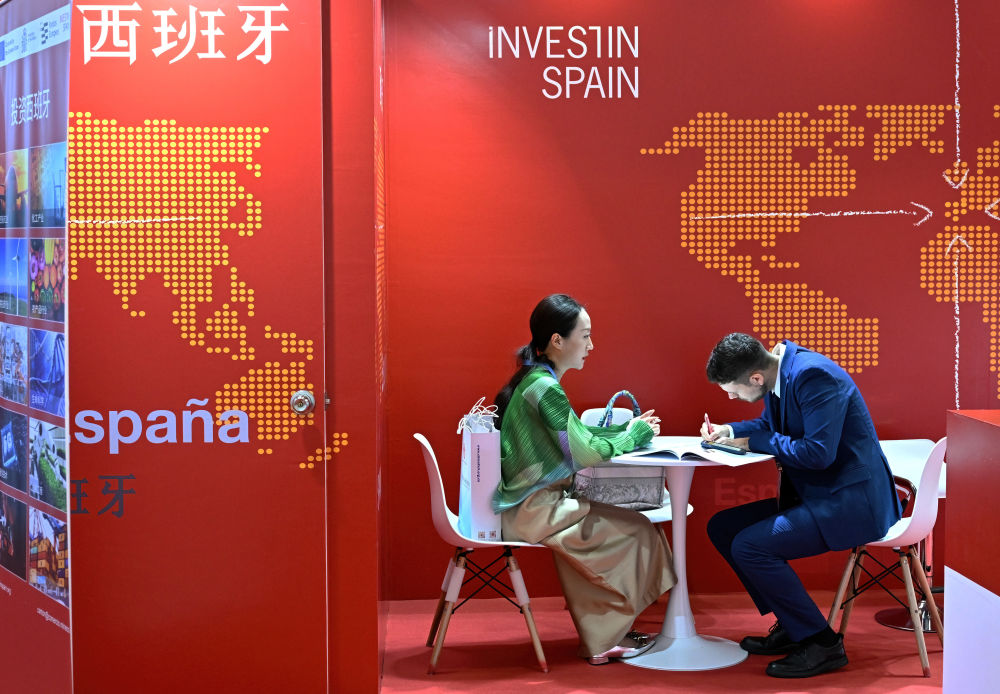 9月8日,在第二十四届中国国际投资贸易洽谈会西班牙馆,两名客商在洽谈。