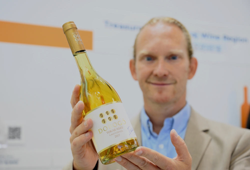 9月8日,来自匈牙利的酒商邵剥洋在展示匈牙利托卡伊葡萄酒产区出品的贵腐酒。