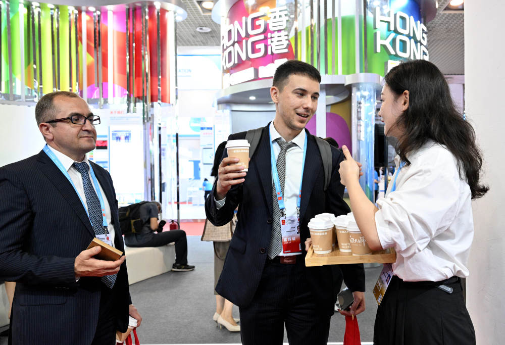 俄罗斯驻华商务代表处武子安(中)和同事在第二十四届中国国际投资贸易洽谈会展馆里品尝福建福鼎白茶(9月8日摄)。