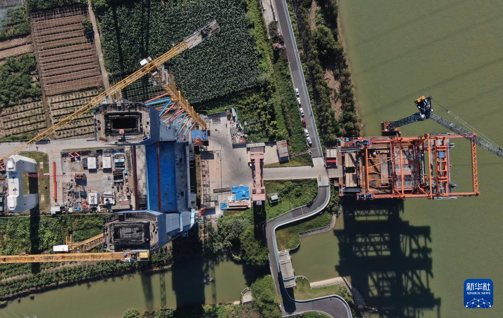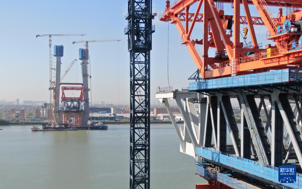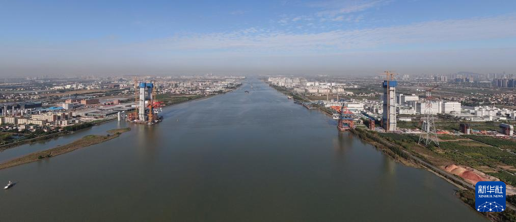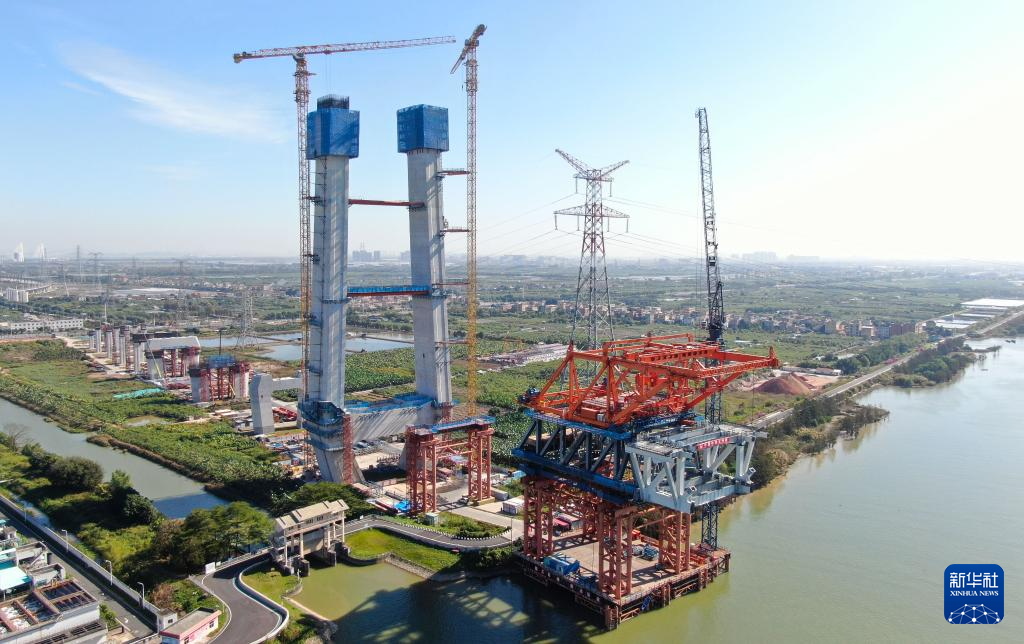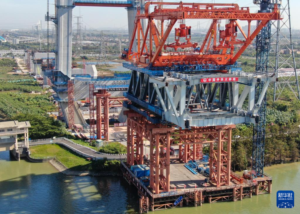 11月30日拍摄的深江高铁洪奇沥水道公铁大桥首节段钢梁架设现场(无人机照片)。新华社记者 邓华 摄