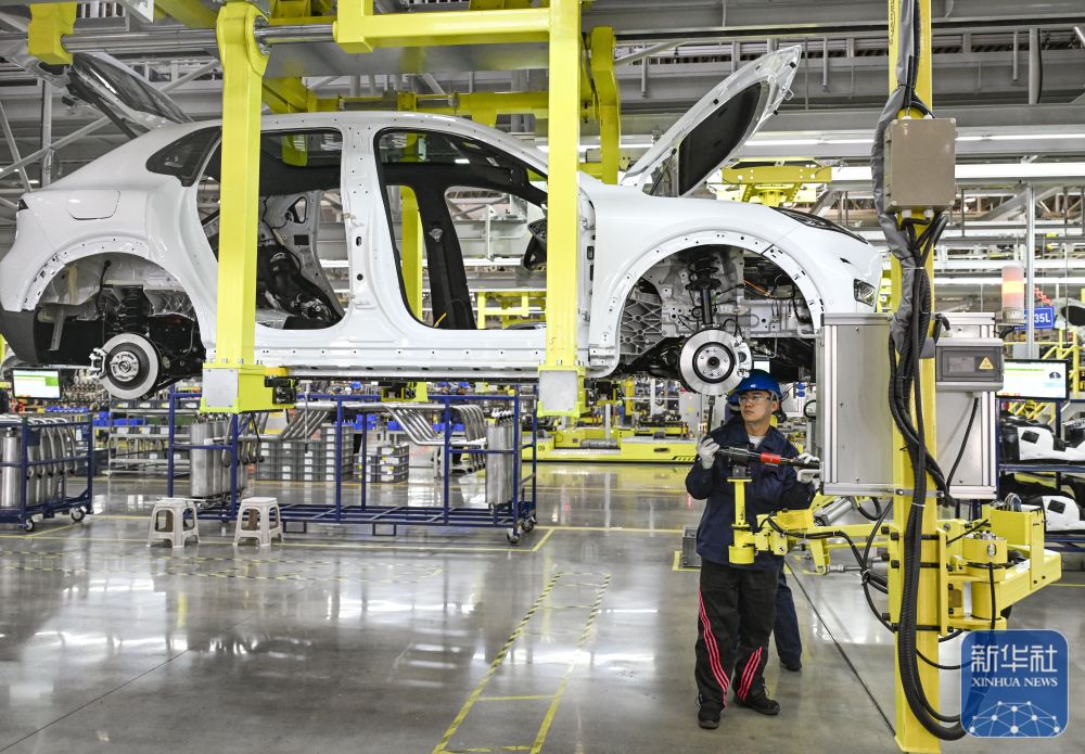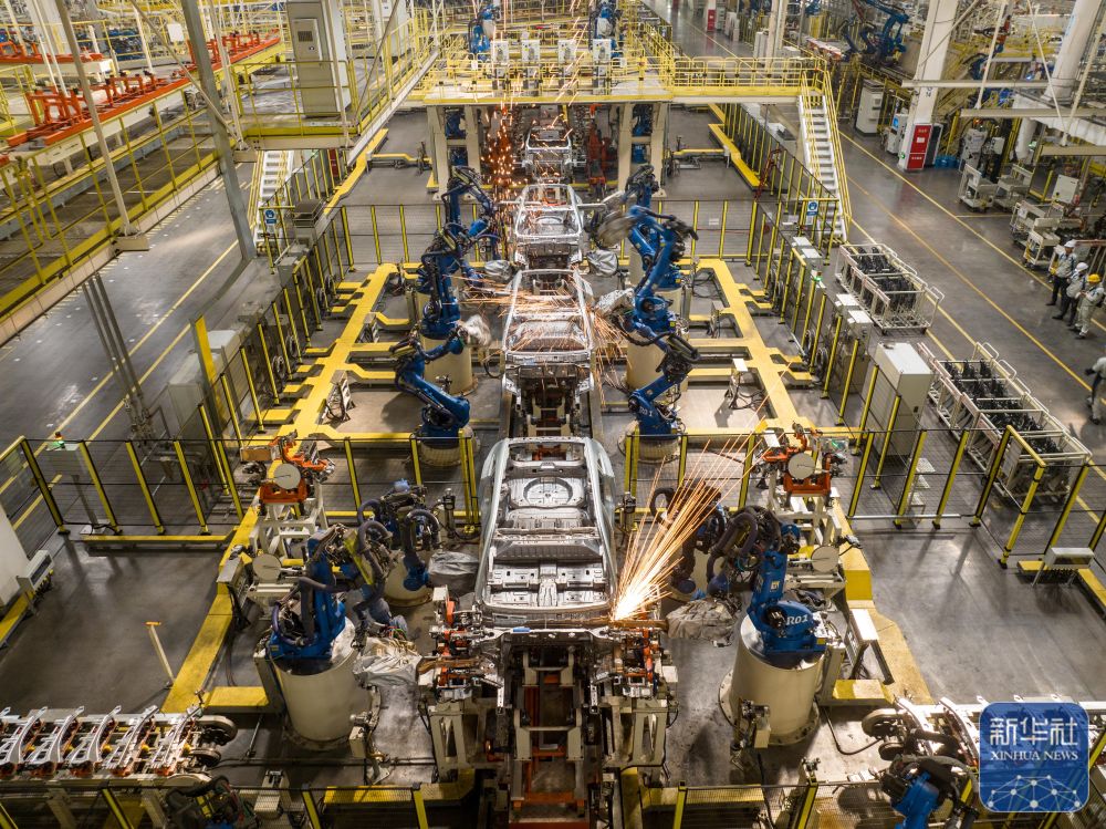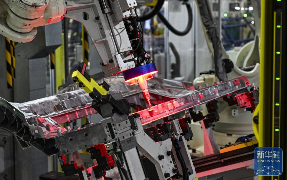 在四川省宜宾市宜宾凯翼汽车有限公司焊装车间,自动机械臂在对新能源车辆进行焊装(2024年3月22日摄)。四川省宜宾市是成渝地区双城经济圈的重要组成部分之一。新华社发(庄歌尔摄)