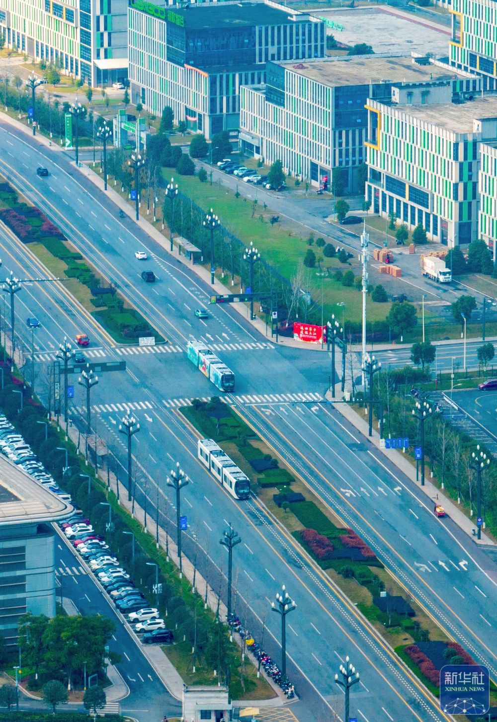 2025年1月9日,两列智轨电车行驶在四川省宜宾市(无人机照片)。四川省宜宾市是成渝地区双城经济圈的重要组成部分之一。新华社发(庄歌尔 摄)