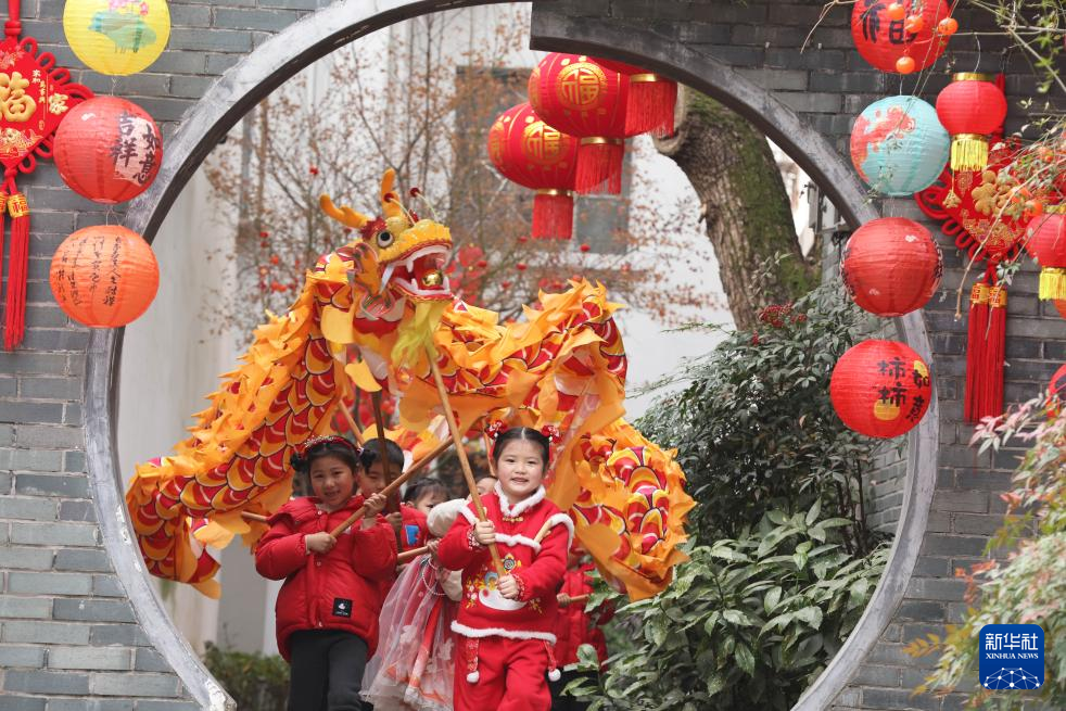 1月23日,在浙江省湖州市德清县乾元镇谈家弄,德清县中心幼儿园小朋友在舞龙。新华社发(倪立芳摄)