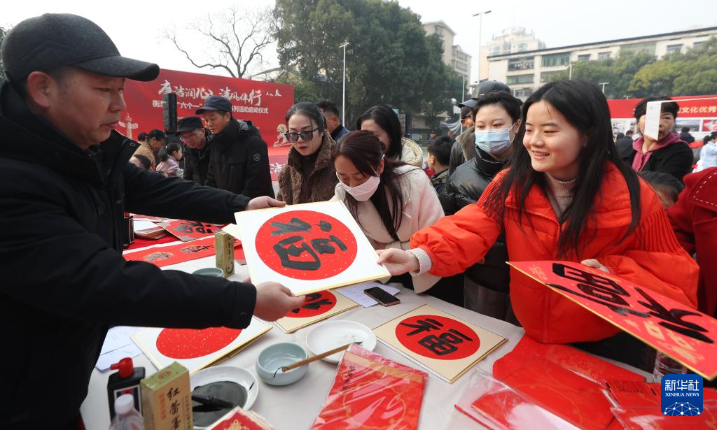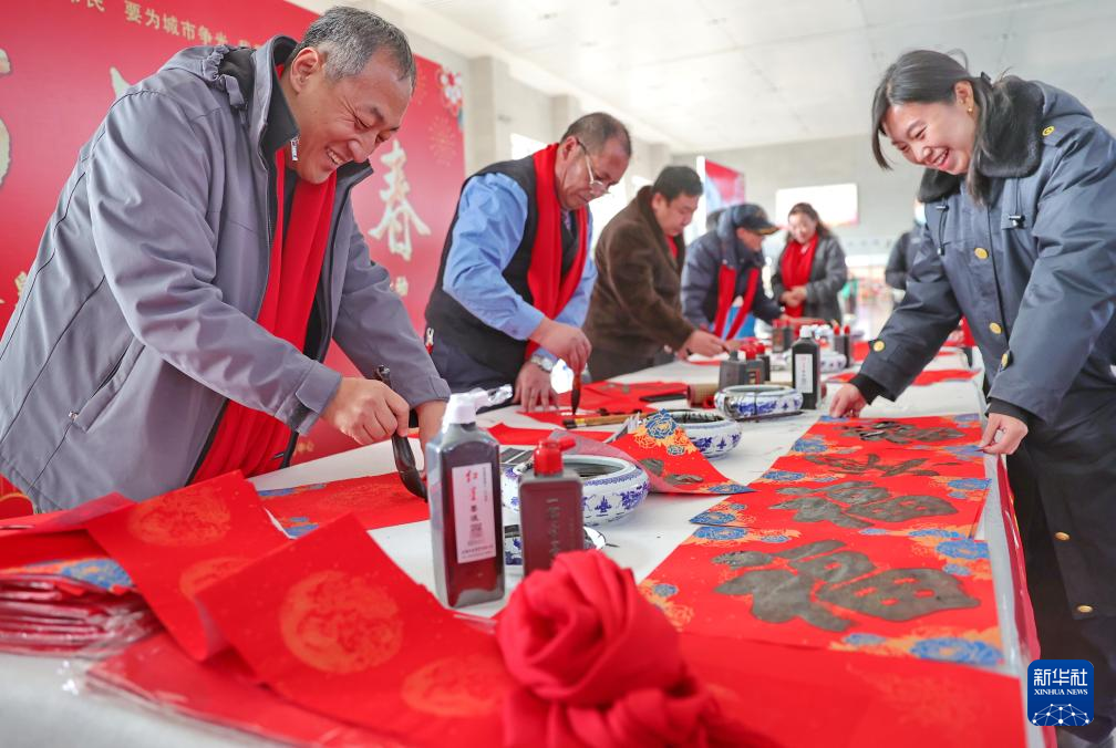 1月23日,在湖南省衡阳市衡东县文体广场,书法爱好者为群众书写对联、福字。新华社发(曹正平摄)