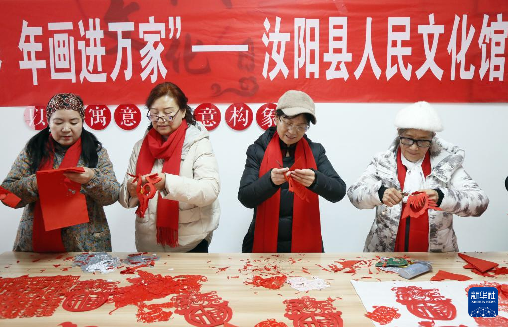 1月23日,河南省洛阳市汝阳县人民文化馆组织县龙乡剪纸协会的剪纸艺人到城关镇杜康社区开展为居民剪年画送祝福活动。新华社发(康红军摄)