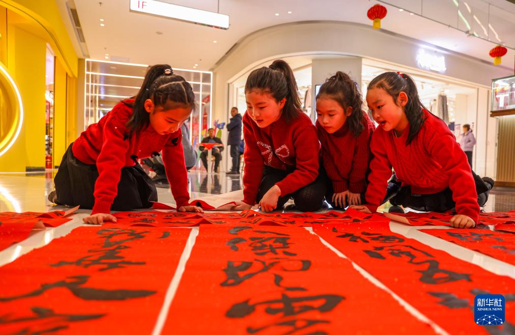 1月23日,在江苏省扬州市江都区,小朋友观看当地书法爱好者写好的春联。新华社发(任飞摄)