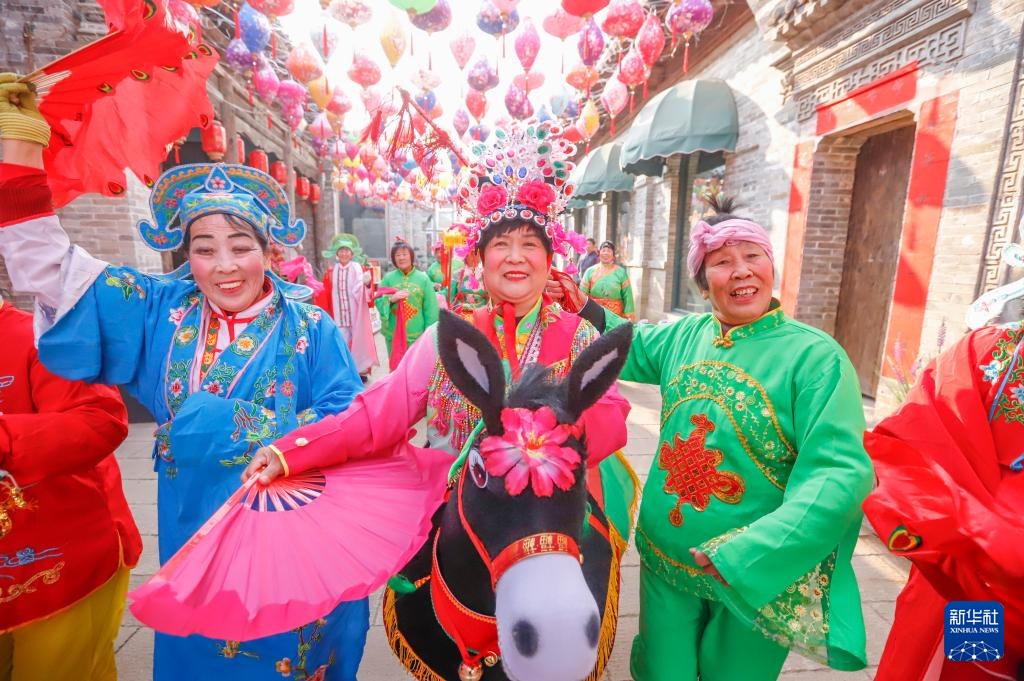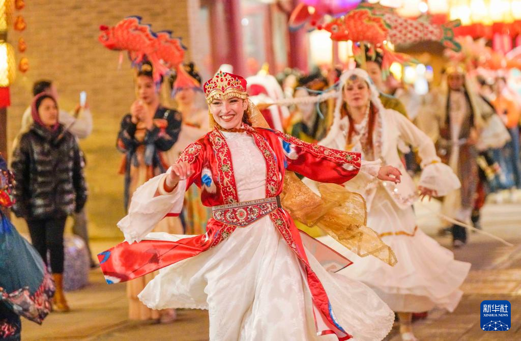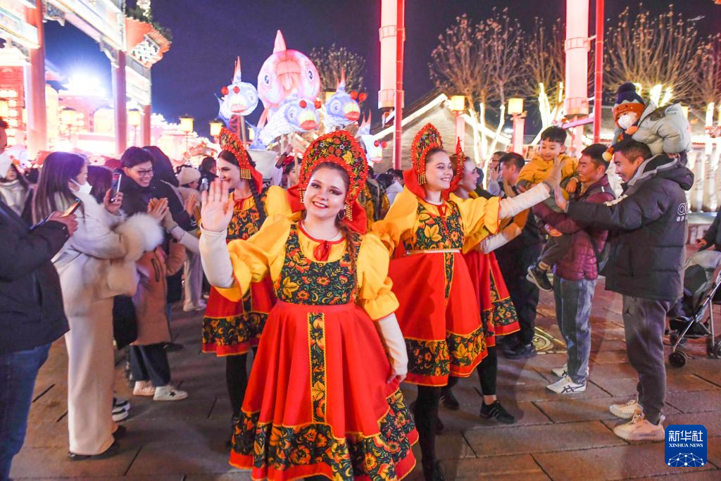 1月22日,外籍演员在河北省唐山市丰南区河头老街景区为游客演出。新华社发(刘满仓摄)